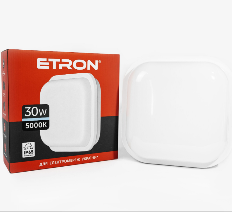 Тип Настінні світильники на стелю Тип джерела світла Світлодіодна LED (інтегрований) Колір Білий Потужність, Вт 30 Вт Еквівалент потужності лампи розжарювання 300 Вт Матеріал основи Пластик Колірна температура 5000K Світловий потік 2550 Лм Форма Квадратна Клас захисту IP IP65 Розміри 221x221x72 мм Кут 140 ° Робочий діапазон напруги, В 185-245 Країна-виробник товару Китай Країна реєстрації бренду Україна Виробник ETRON Гарантія 24 місяці